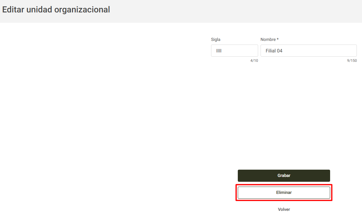 El sistema permite eliminar una Unidad Organizacional. Para ello, es necesario que el usuario tenga el permiso Eliminar unidades organizacionales habilitado en su grupo de permisos, conforme se detalla en este artículo.
