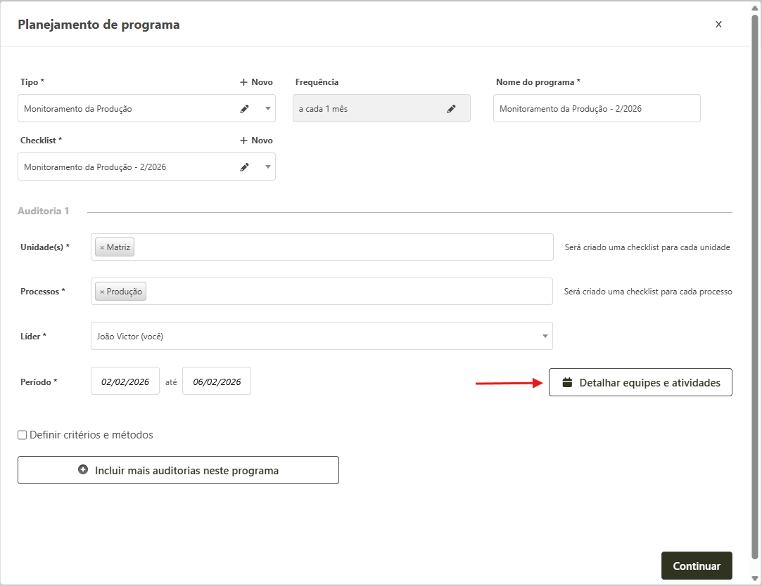 - No momento de criação de um novo planejamento de auditoria clique no botão Detalhar equipes e atividades