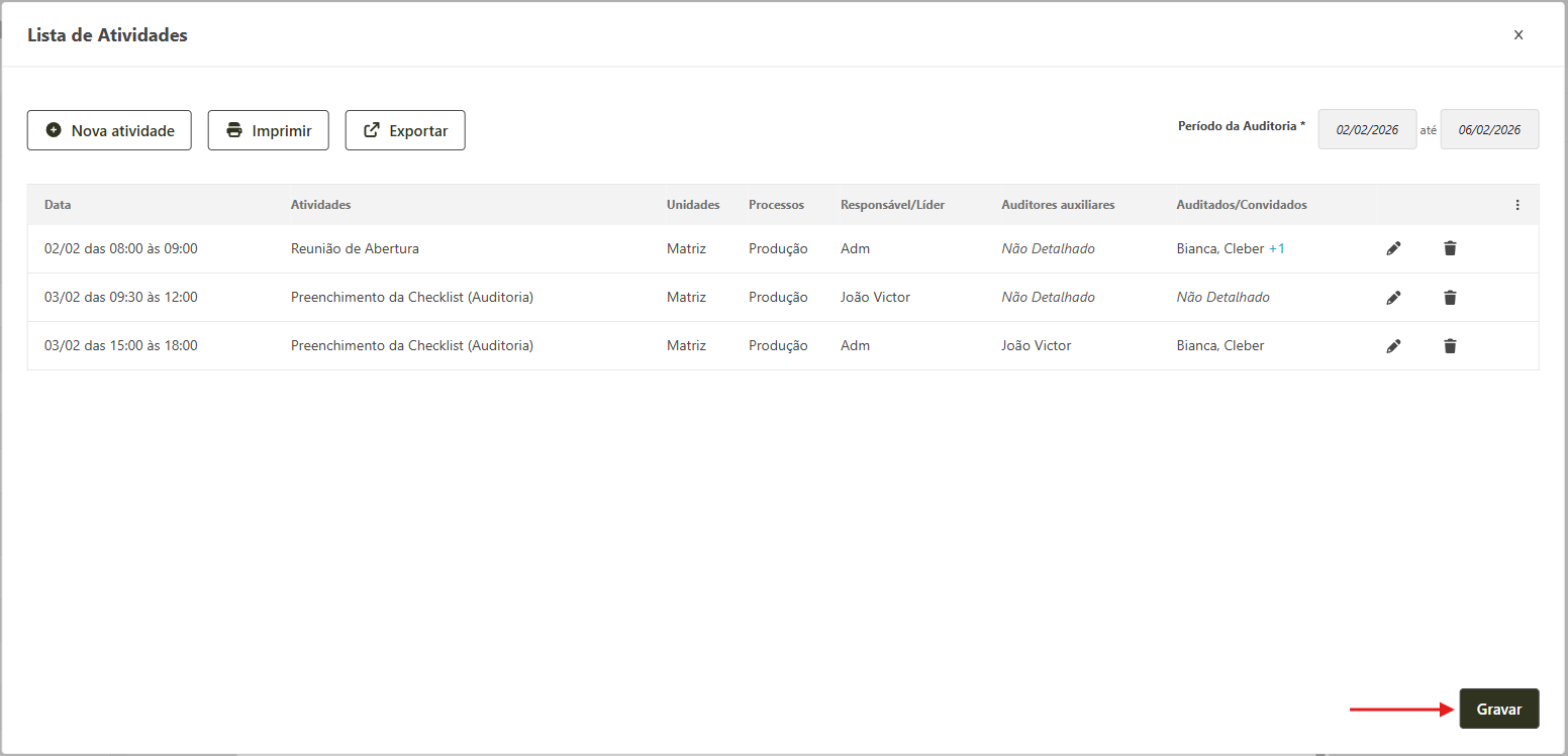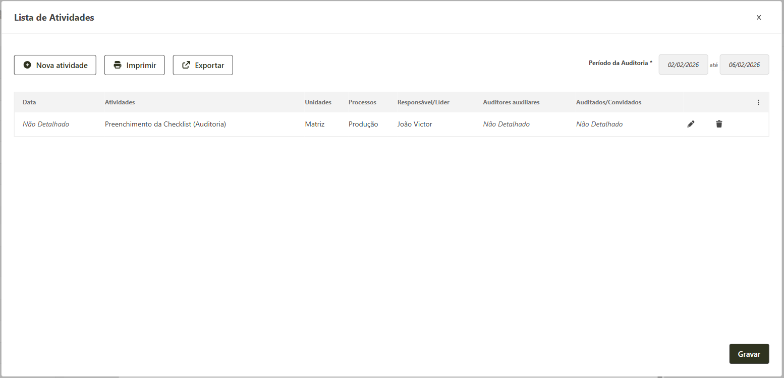 Por padrão o sistema já trará cadastrada as atividades de preenchimento de cada processo vinculado ao programa de auditoria.