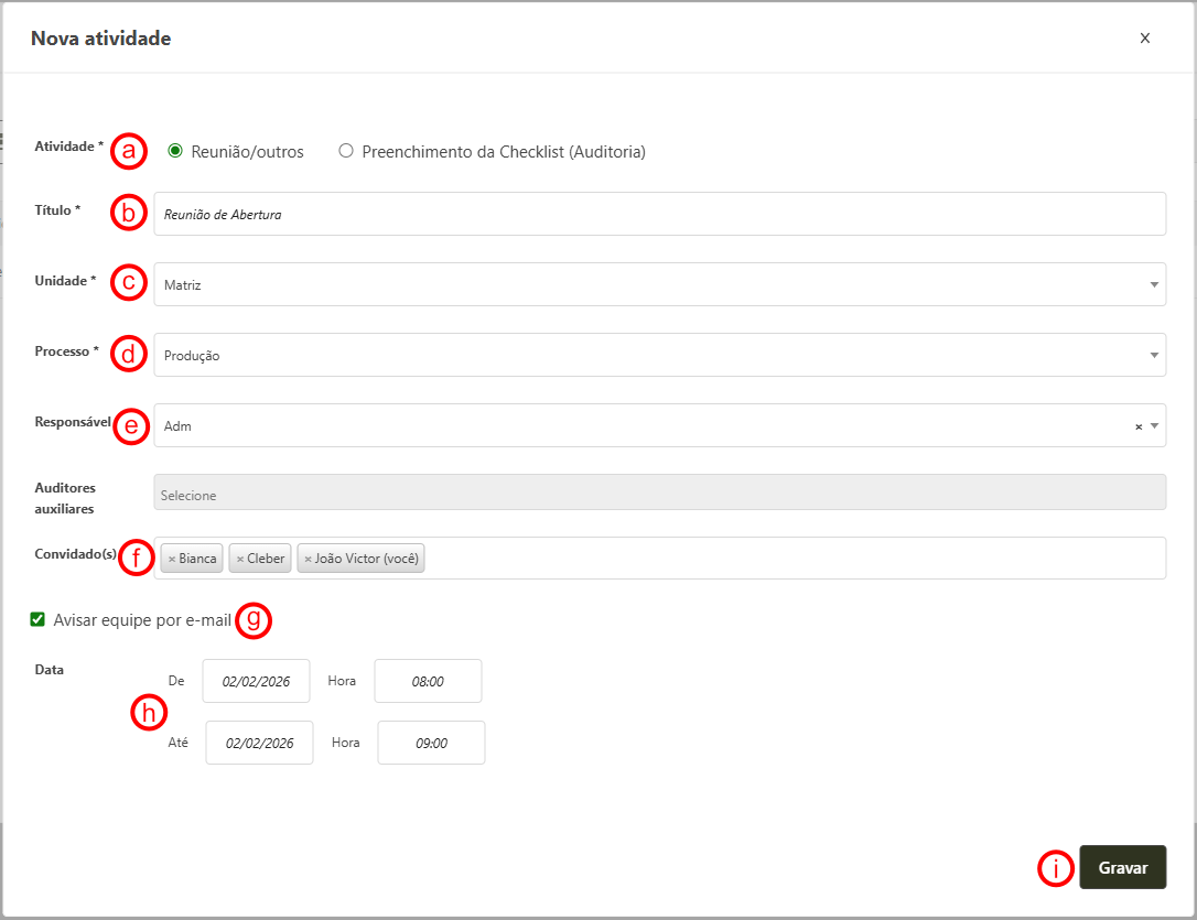 - Auditores auxiliares: selecione as pessoas auxiliares que estão envolvidas no processo de auditoria. Não é um campo obrigatório de preenchimento.