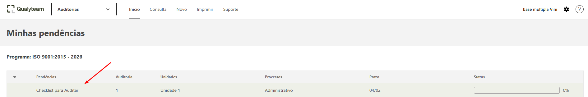 Assim que a o planejamento da auditoria for finalizado, o sistema irá notificar o responsável pela auditoria e gerar a pendência de preenchimento da checklist. A pendência ficará localizada na tela de início do auditor do processo definido na etapa de detalhamento das equipes e atividades.