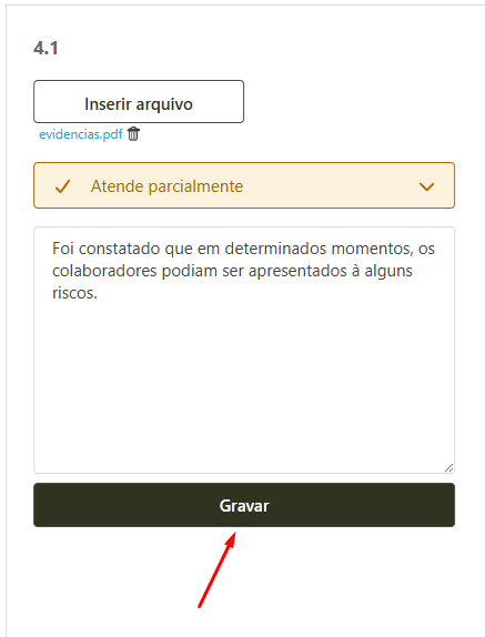 Ao selecionar os itens Atende parcialmente, Não atende ou Não se aplica, o sistema irá solicitar obrigatoriamente a inserção de uma evidência para justificar a escolha dessas opções.