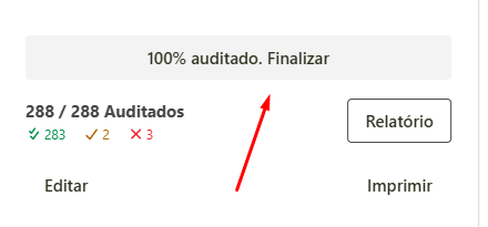 Caso você não tenha iniciado o preenchimento da checklist, é possível imprimir a mesma para que se faça o preenchimento no papel para posteriormente passar para o sistema. - Ao finalizar a avaliação de todos os itens exibidos na tela e quando todos os itens estiverem auditados clique em 100% auditado. Finalizar