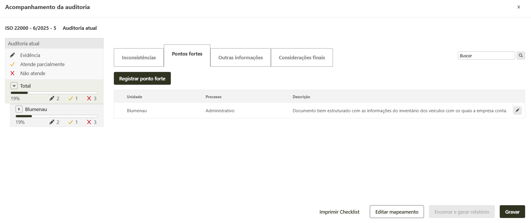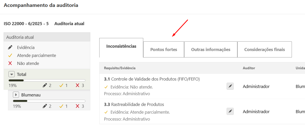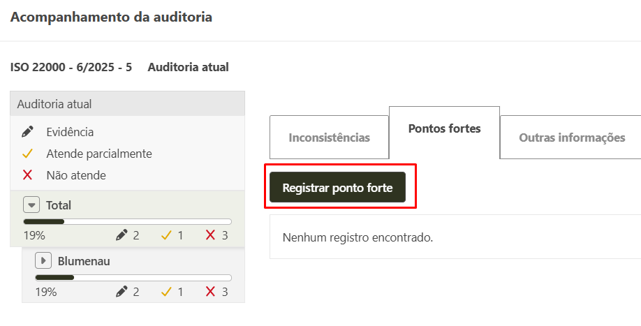 - Ao gravar o ponto forte, o mesmo poderá ser visualizado na tela de acompanhamento e na tela de detalhes da auditoria