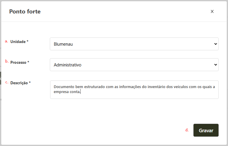 - Unidade: indique em qual unidade da empresa o ponto forte foi identificado;