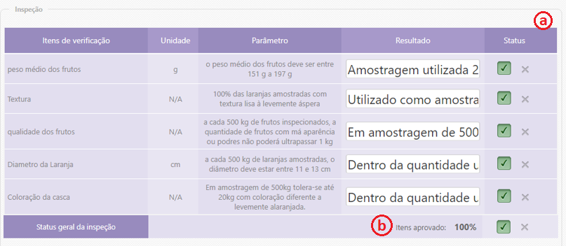 - Para realizar a inspeção informe os resultados de acordo com cada item selecionado na tela de cadastro do produto.