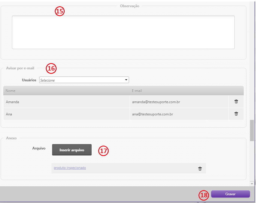 - Caso desejar também poderá avisar outros usuários sobre esta inspeção realizada, para isto no campo Avisar por e-mail selecione os usuários que desejar comunicar.