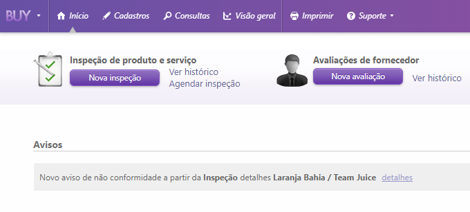 , respectivamente. Caso a inspeção seja avaliada como não conforme, o sistema vai gerar o RNC (relatório de não conformidade) que será enviado ao fornecedor. Lembrando que o aviso de não conformidade ficará pendente para o responsável conforme definido nas configurações do sistema.