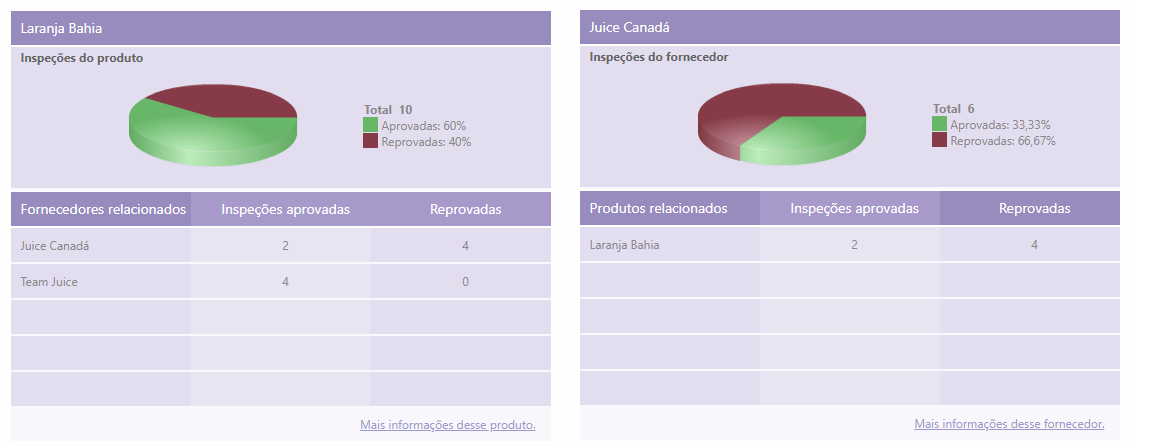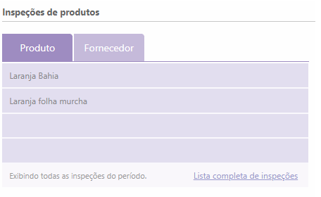 No primeiro quadro, na guia Produto, estarão relacionados os últimos produtos/serviços inspecionados. Na guia Fornecedor será exibido os últimos fornecedores que tiveram produtos/serviços inspecionados, no período estabelecido.