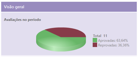 No mesmo bloco, à direita, o gráfico representa a visão geral indicando o total de avaliações realizadas no período, apontando o percentual de aprovadas e reprovadas.