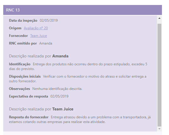Ao clicar em qualquer RNC listado no quadro, no canto direito o sistema irá abrir os detalhes desse registro, contendo todas as informações da não conformidade.