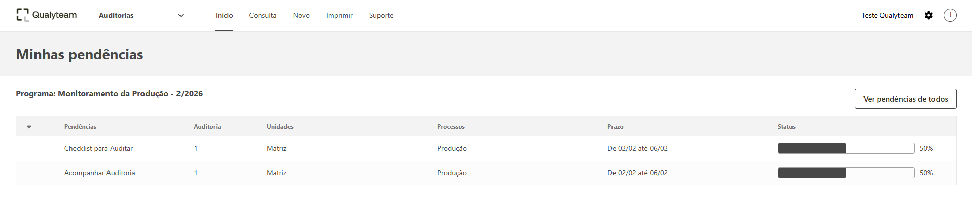 O usuário consegue acompanhar qual é o tipo de pendência, qual é a auditoria, a unidade que será auditada, os processos que serão auditados, qual foi o prazo definido e o status de cada atividade, sendo que o status é alterado conforme o preenchimento das checklists.
