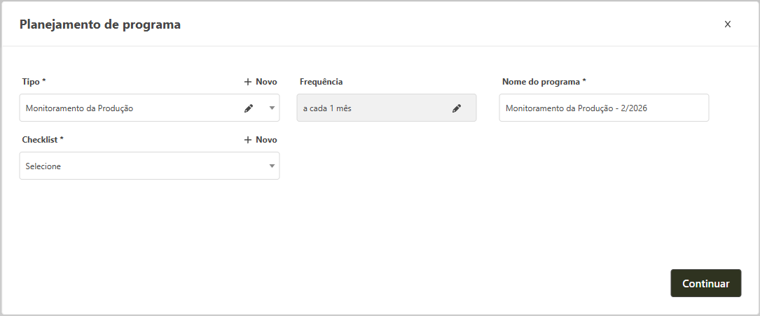 Ao finalizar o cadastro de um novo tipo, o sistema deixará disponível para realizar um novo planejamento de programa. A partir desse momento você já pode cadastrar uma nova checklist para as próximas auditorias, ou se não quiser continuar com o cadastro de um novo planejamento feche a janela.
