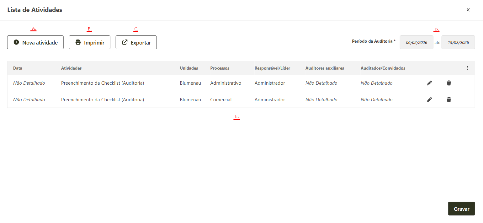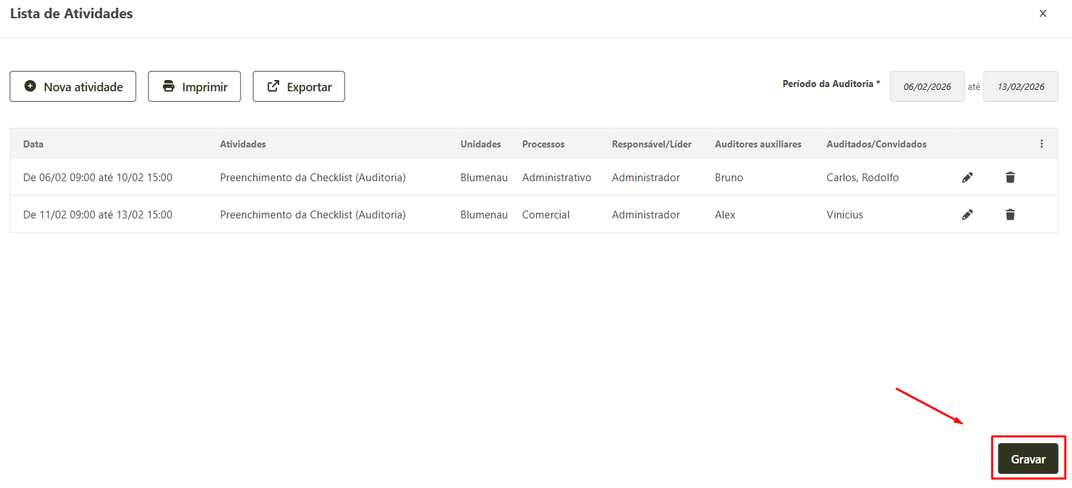 Imprimir: permite imprimir a lista de atividades programadas para o período de auditoria.