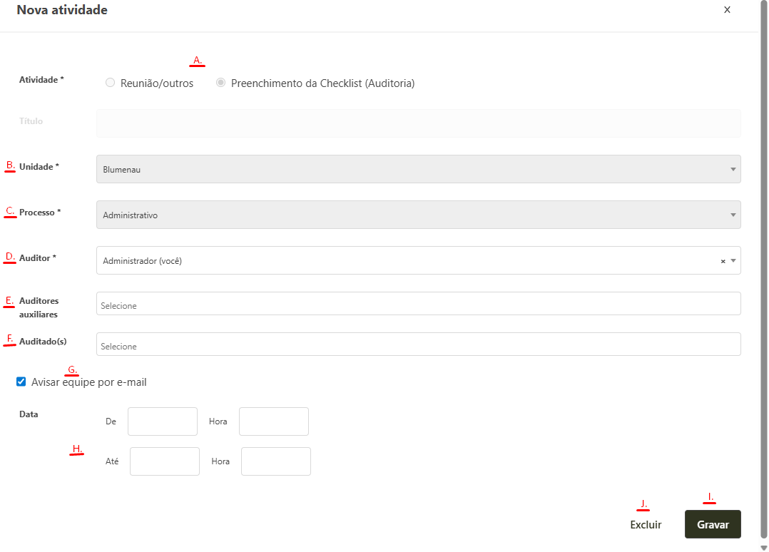 Atividade: nesse campo o sistema informa se é uma reunião ou preenchimento da checklist. Esse campo só permite ser selecionado quando uma nova atividade é cadastrada.