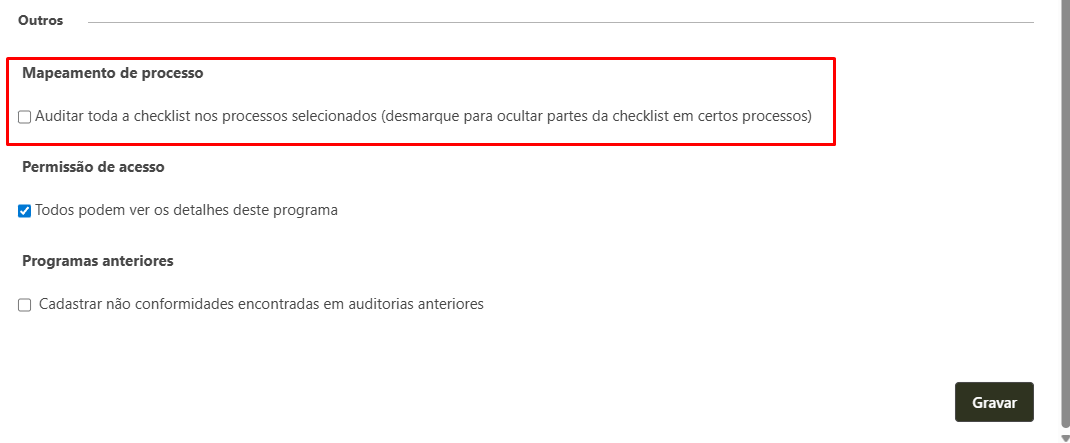 Antes de finalizar o cadastro do programa, se o responsável pelo cadastro desmarcou a opção Auditar todo o checklist nos processos selecionados (desmarque para ocultar partes do checklist em certos processos) ele poderá mapear os itens para os respectivos processos.