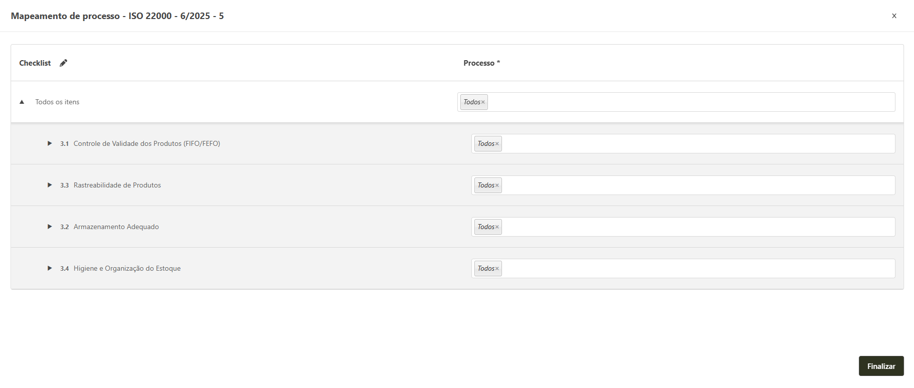 Em certas situações, temos uma checklist com vários itens e nem todos os itens se aplicam ao processo que será auditado, pensando nessa situação, o auditor fornece a opção Mapeamento de processo.