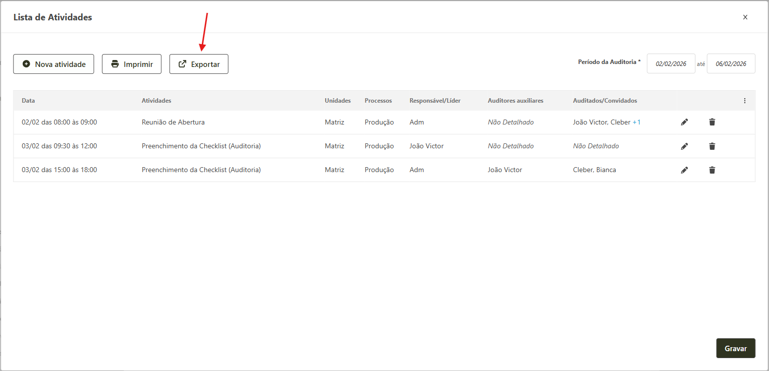 - Após detalhar todas as atividades e as pessoas envolvidas, na lista das atividades cadastradas clique no botão Exportar.
