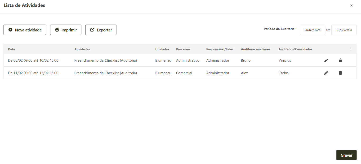 - Na tela da listagem das atividades o sistema irá mostrar todas as atividades cadastradas para o programa de auditora.