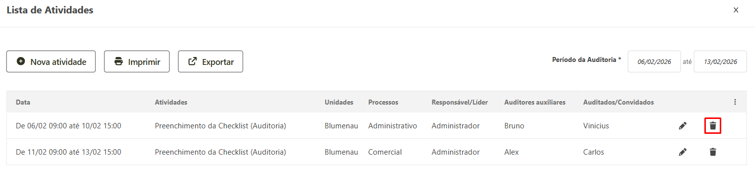 Caso a atividade cadastrada não fará mais parte da programação da auditoria ou simplesmente foi cadastrada equivocadamente, é possível fazer a exclusão da mesma.
