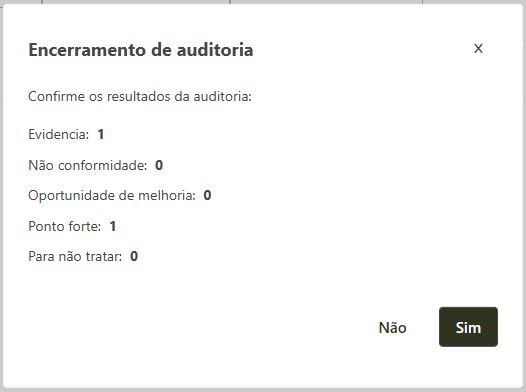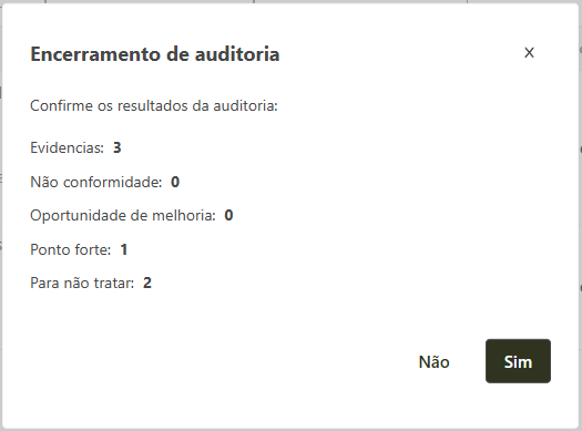 , o sistema irá solicitar a confirmação do encerramento da auditoria e irá exibir o resumo da quantidade de não conformidades, oportunidades de melhoria, pontos fortes e inconsistências apontadas, conforme imagem abaixo. Se os dados estiveram corretos clique em Sim para confirmar o encerramento.