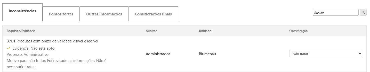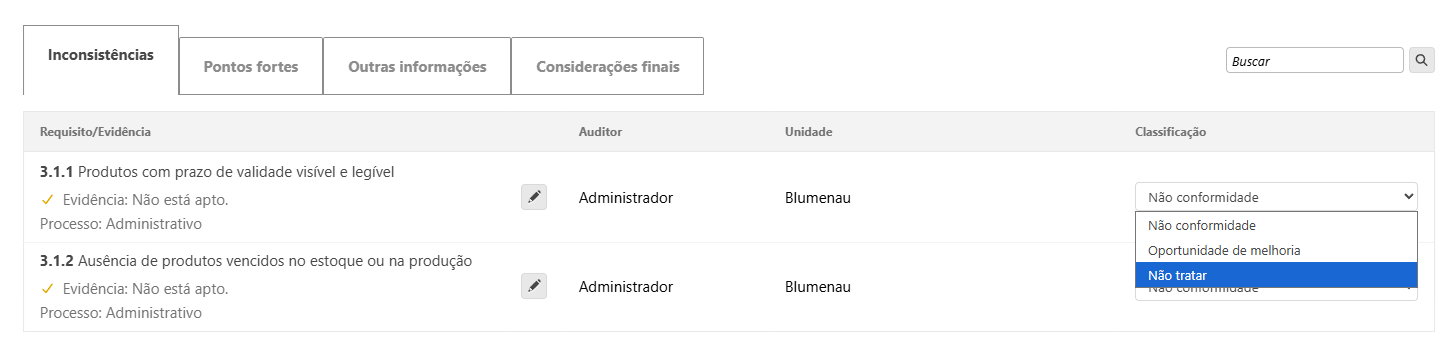 Porém se inconsistências foram apontadas, antes de finalizar a auditoria, você deve realizar a classificação de cada apontamento, basta clicar sobre as inconsistências e selecionar entre as opções disponíveis: Não conformidade, Oportunidade de melhoria ou Não tratar.