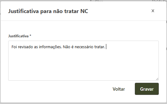 Caso selecione a opção Não tratar, obrigatoriamente será necessário a inclusão de uma justificativa, que deve ser preenchida na tela aberta. Após inserida a justificativa, clique em Gravar para confirmar.
