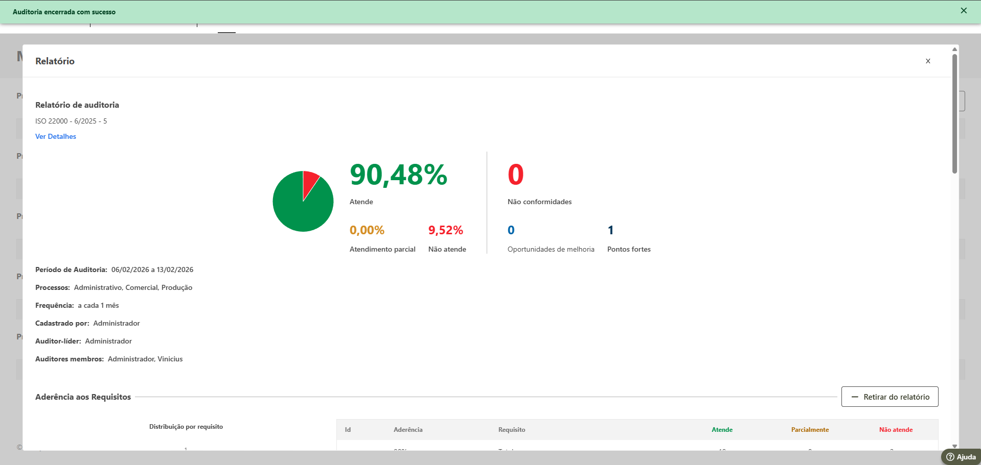 O sistema irá exibir a mensagem de confirmação de encerramento e na sequência trará o relatório da auditoria encerrada.