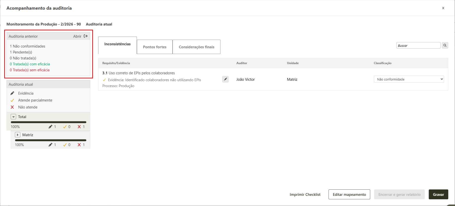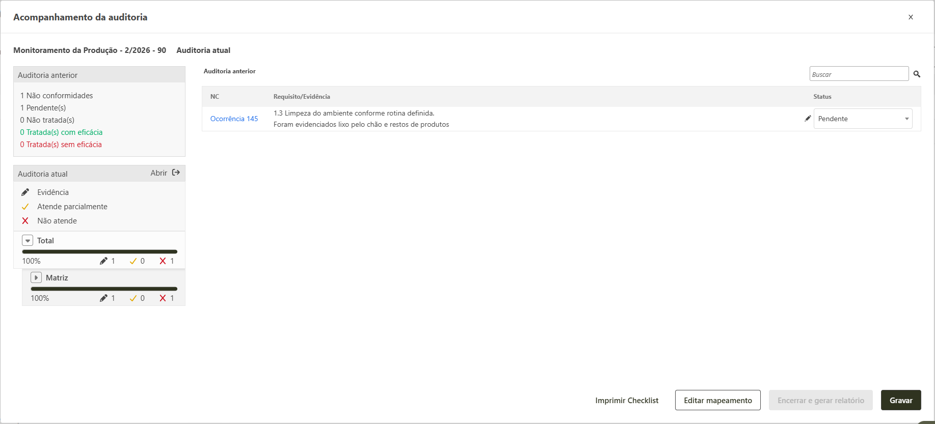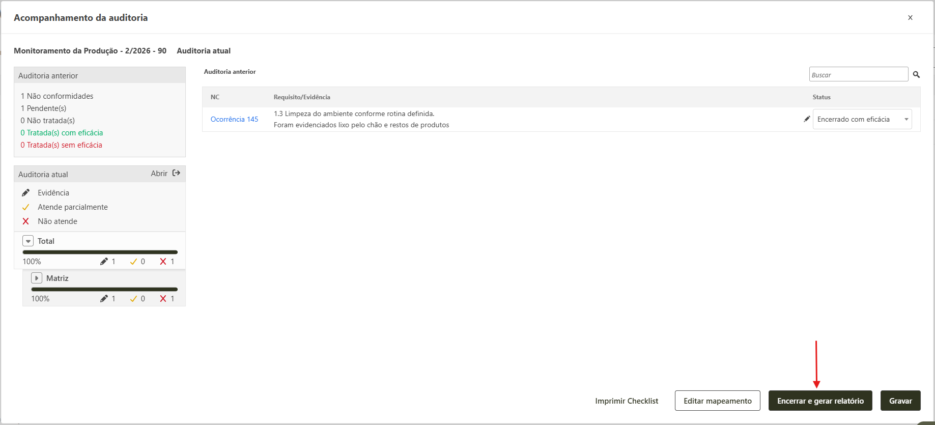 - Ao finalizar a avaliação das não conformidades anteriores, automaticamente o sistema habilitará o botão Encerrar e gerar relatório. Nesse momento a sua auditoria poderá ser finalizada e poderá consultar o resultado da mesma na tela de consulta.
