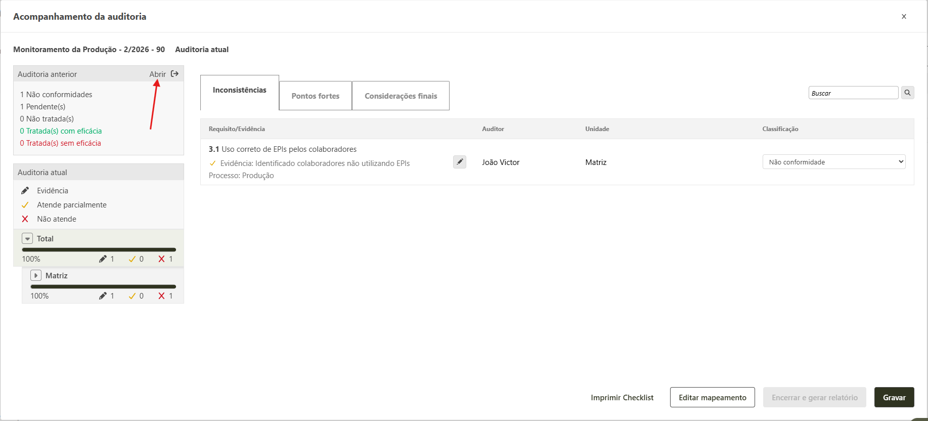 - Para que você consiga finalizar essa auditoria, estas não conformidades deverão ser avaliadas. Para isso clique no botão Abrir.