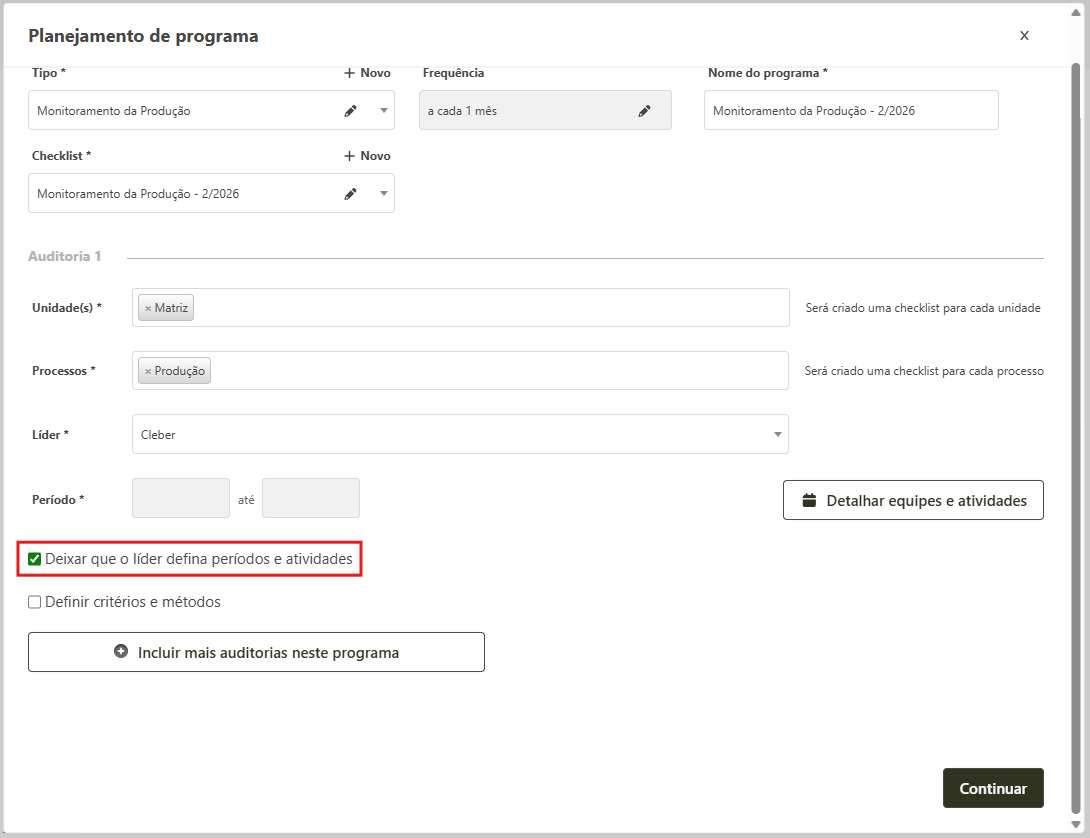 No momento da criação de um novo programa de auditoria, é possível determinar que o auditor líder defina o período da auditoria e também as equipes e atividades. Para isso o usuário que está cadastrando o programa, deve marcar a opção Deixar que o líder defina períodos e atividades