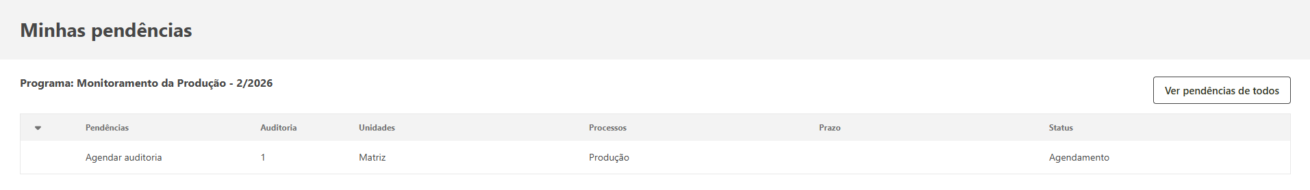Assim que o agendamento for finalizado, o sistema emitirá um aviso de que a auditoria foi iniciada e as pendências de preenchimento da checklist e acompanhamento da auditoria serão geradas para os responsáveis definidos.