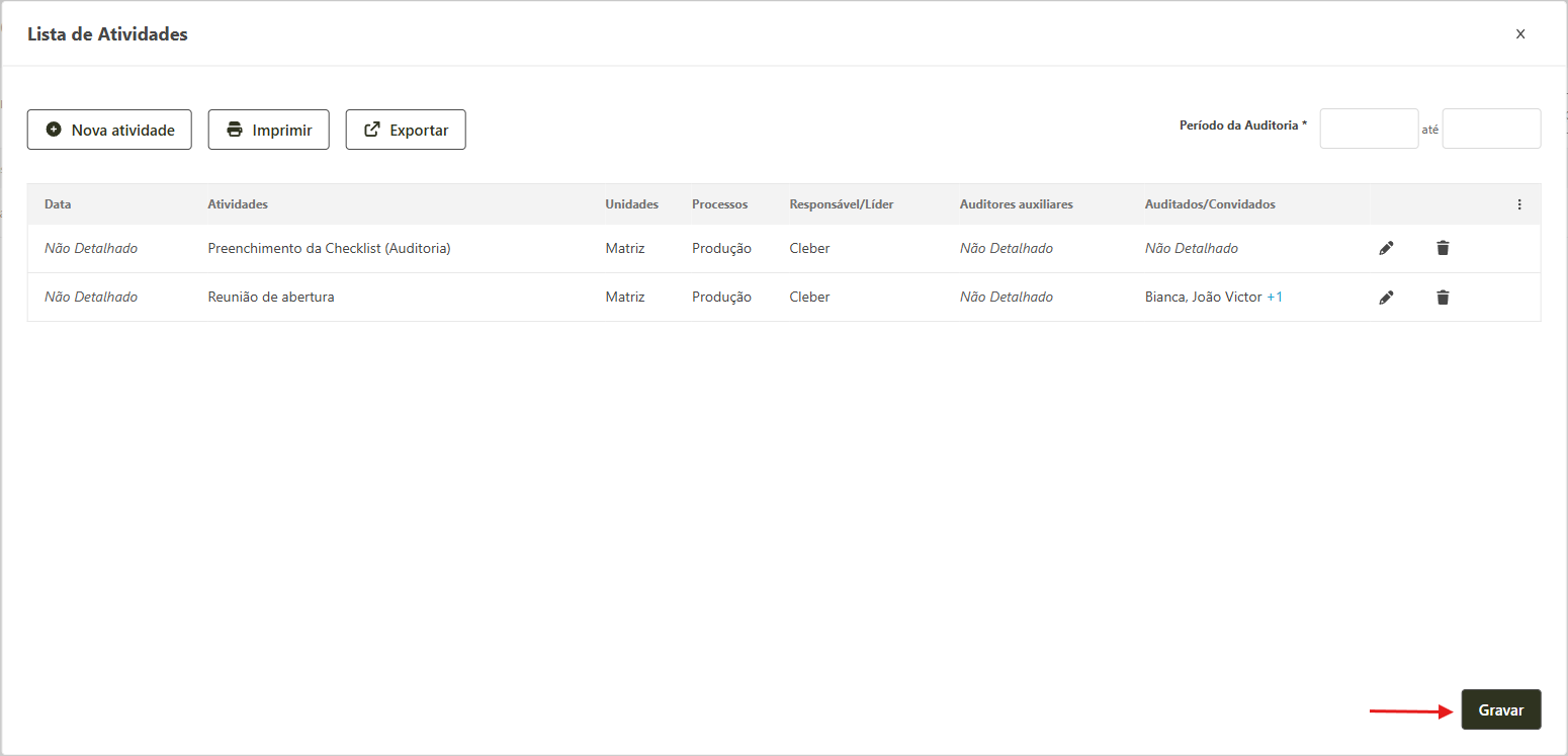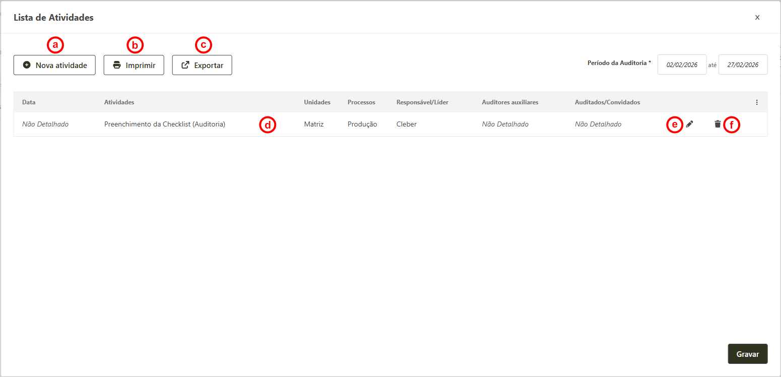 Imprimir: permite imprimir a lista de atividades programadas para o período de auditoria.
