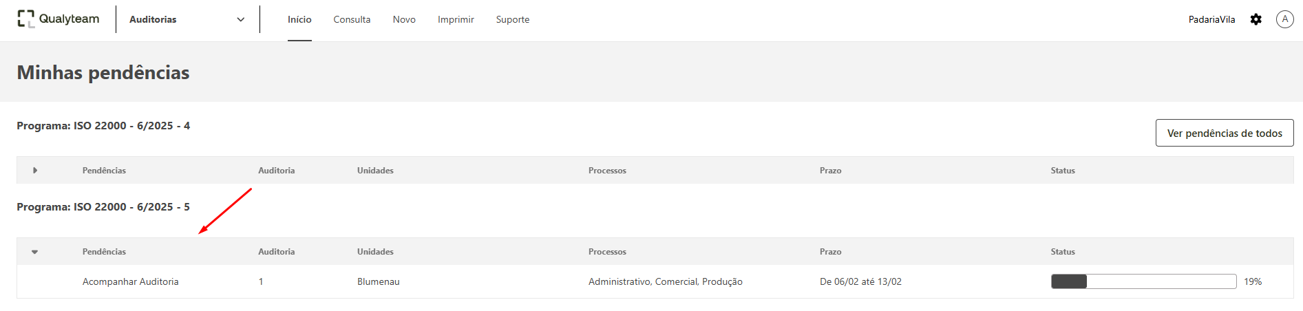 - Na tela de início, localize a pendência de acompanhamento da auditoria.