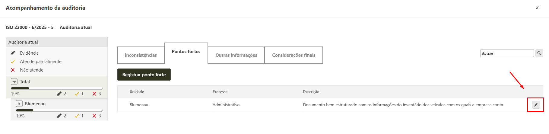 - Na aba Pontos fortes, ao passar o mouse sobre o ponto forte cadastrado, clique no botão Editar.
