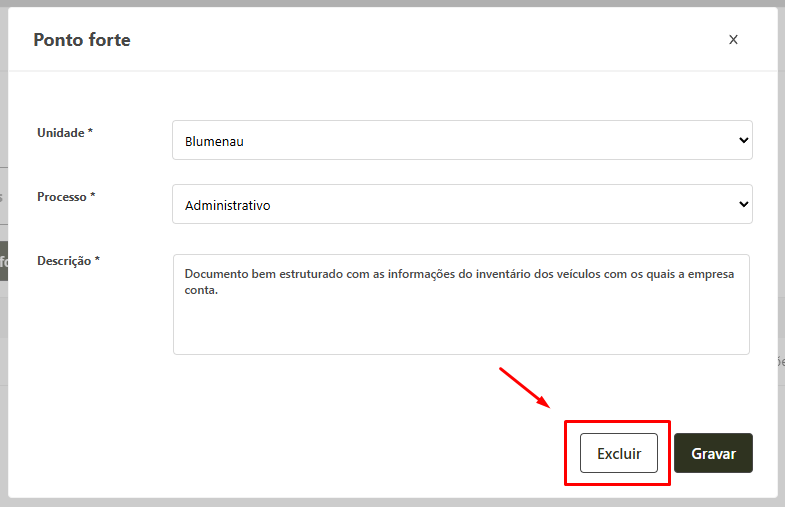 Para efetuar a exclusão de um ponto forte cadastrado, siga os passos abaixo: