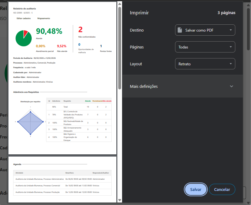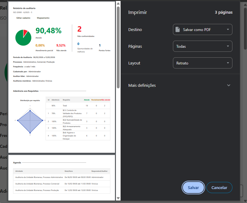 - Ao clicar sobre o mesmo, serão exibidas as configurações da impressora para ajustar a impressão. Clique em Salvar para confirmar a impressão ou em Cancelar caso não queira mais realizar a impressão.