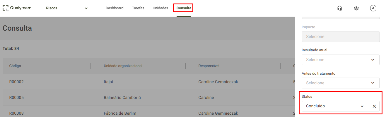 Acesse a tela de consulta e localize o risco concluído. Se preferir, utilize o filtro de Status: Concluído para facilitar a busca:
