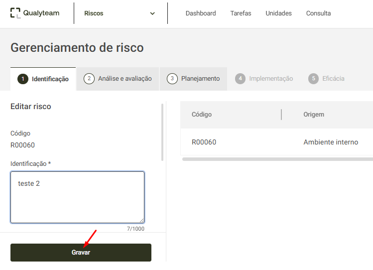 Ao clicar para editar o risco, o sistema abrirá uma nova tela onde estarão disponíveis os campos do risco, altere as informações conforme a necessidade e após clique em Gravar: