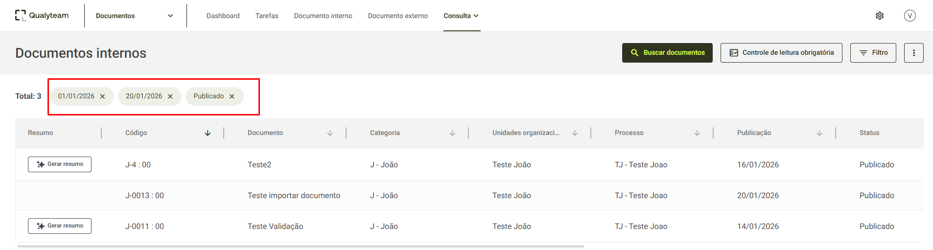 As opções definidas nos filtros serão exibidas no cabeçalho da consulta de documentos, como mostra a imagem abaixo: