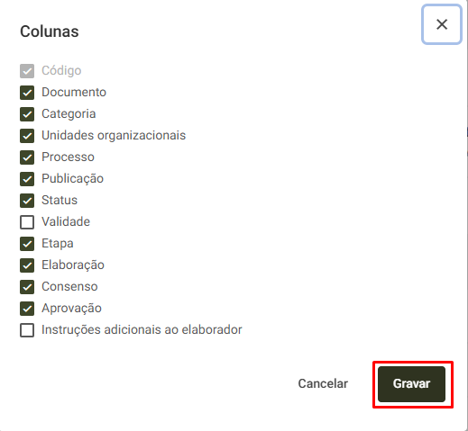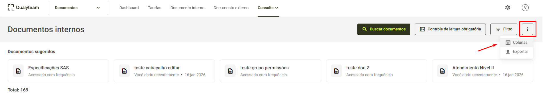 É possível personalizar a consulta de documentos, incluindo ou excluindo itens da visualização. Para isso, clique sobre o botão com três pontos localizado no canto direito da sua tela e selecione a opção Colunas: