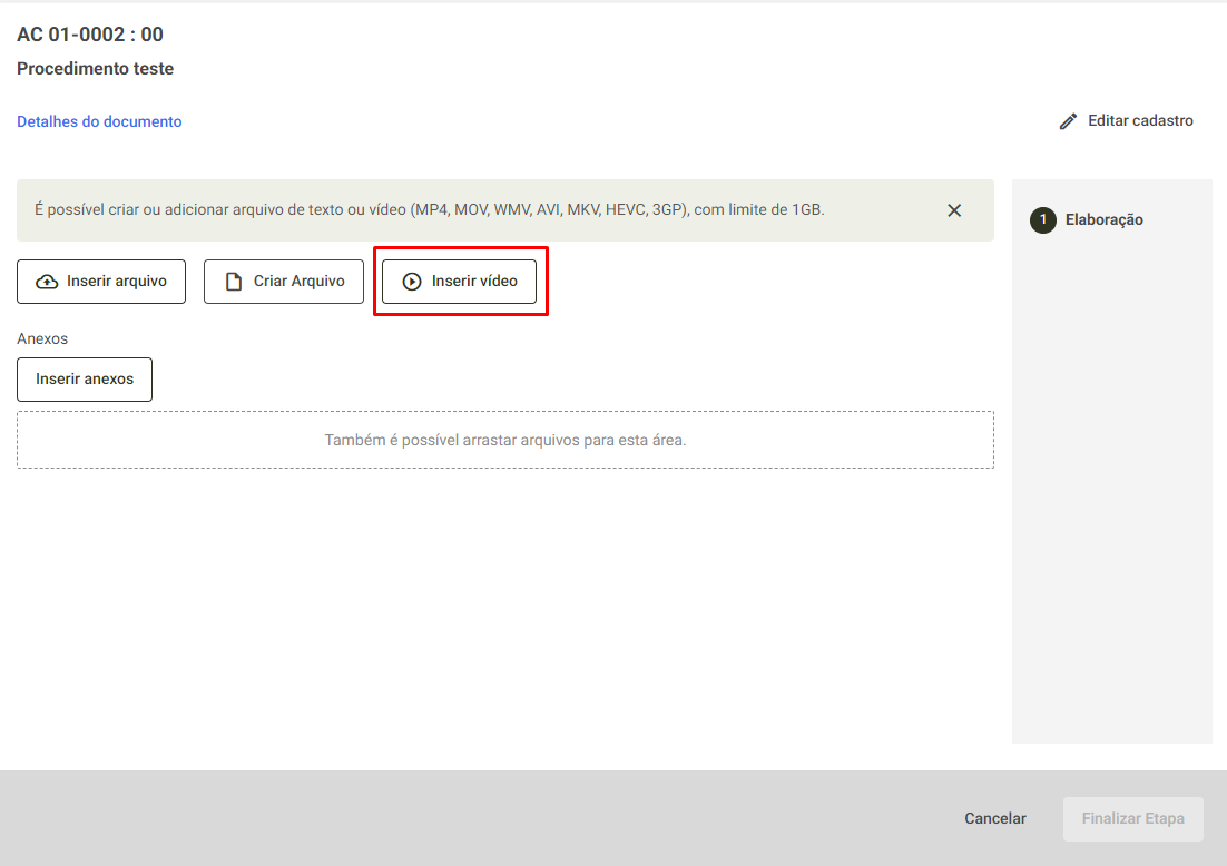 Nessa mesma tela, você pode inserir um arquivo com seu documento elaborado, criar o arquivo para enviar à próxima etapa ou inserir um vídeo.