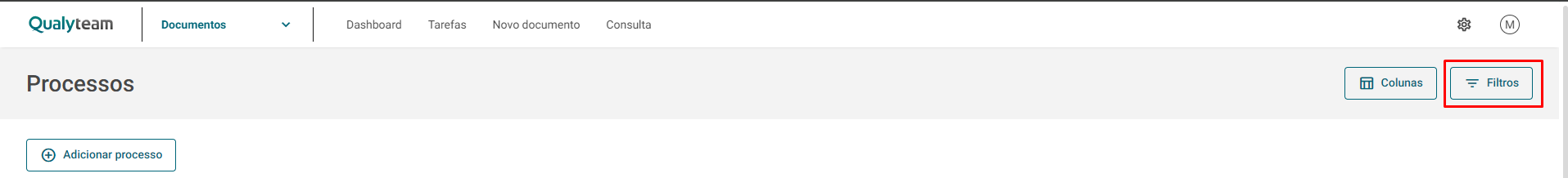 - Para ajudar na localização dos processos cadastrados, você poderá clicar em Filtros. Onde você poderá filtrar por sigla, nome ou se está ativo ou inativo.