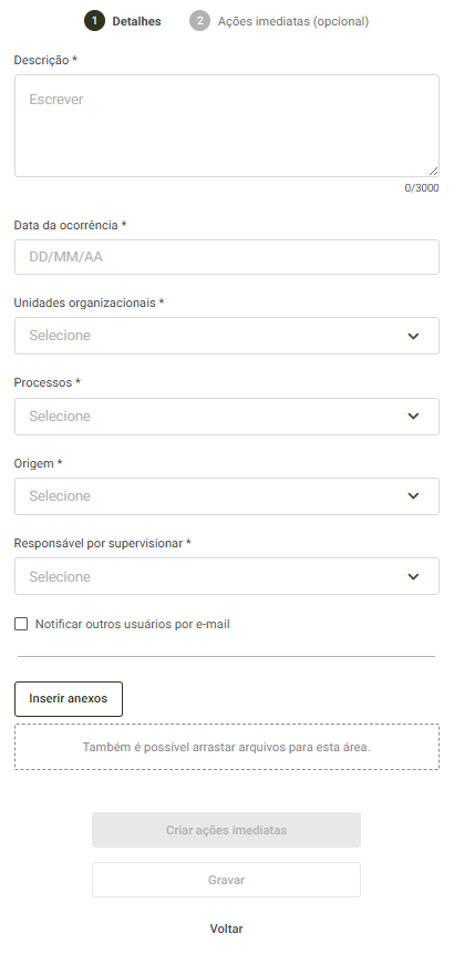 Caso o usuário cadastrante opte por cadastrar as ações imediatas, basta clicar no botão "Criar ações imediatas". Na tela que abrir, clique no botão "Adicionar ação imediata", e preencha os campos obrigatórios. Ao finalizar o preenchimento, clique em "Gravar".
