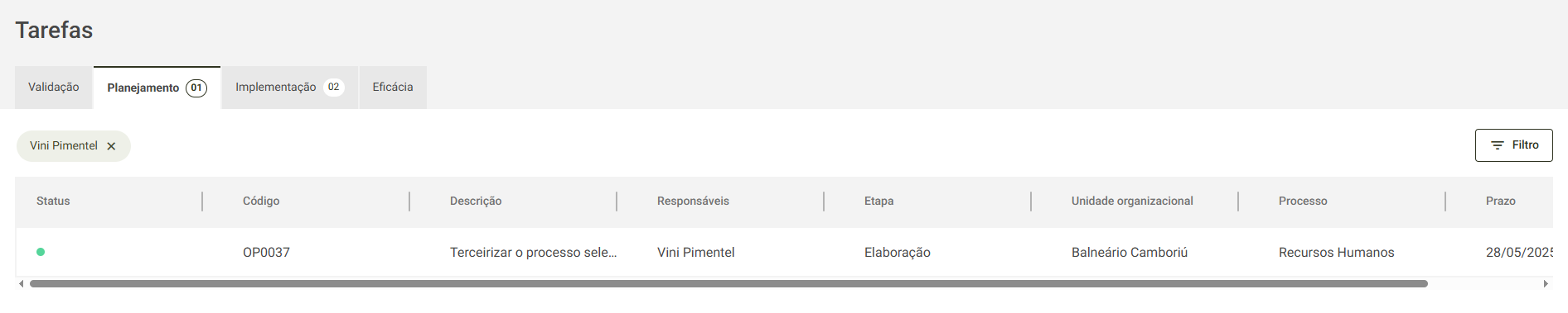 Após a Oportunidade de Melhoria ser validada, uma tarefa de planejamento é disparada para o usuário selecionado como responsável pela etapa: