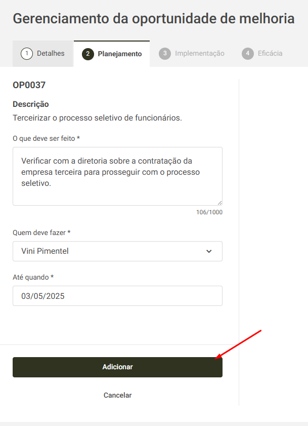 Ao clicar sob a tarefa, uma tela com campos de criação de ação será aberta, onde o responsável poderá descrever o que será feito, quem deve fazer, e o prazo daquela ação. Quando finalizar o preenchimento, basta clicar em "Adicionar", e a ação será cadastrada no plano: