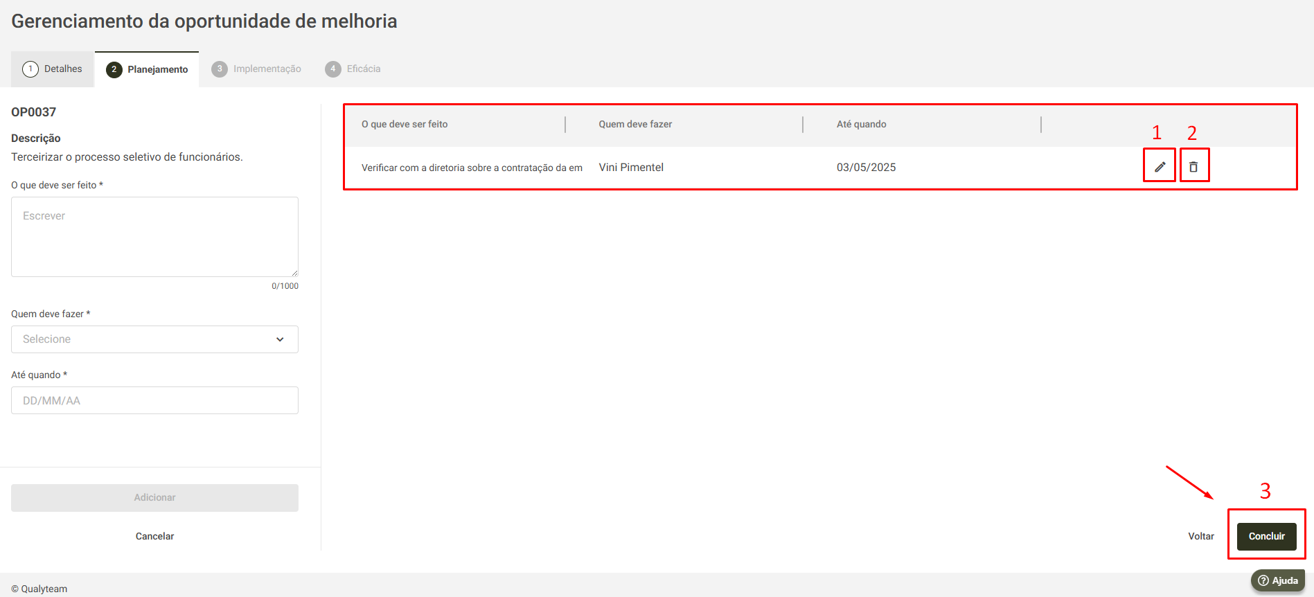 Depois de adicionar a primeira ação, o responsável pode prosseguir e cadastrar mais, conforme a necessidade, repetindo o fluxo acima, ou, ele poderá editar a ação cadastrada (1), excluir a ação (2), ou finalizar a tarefa de planejamento, clicando no botão "Concluir" (3):