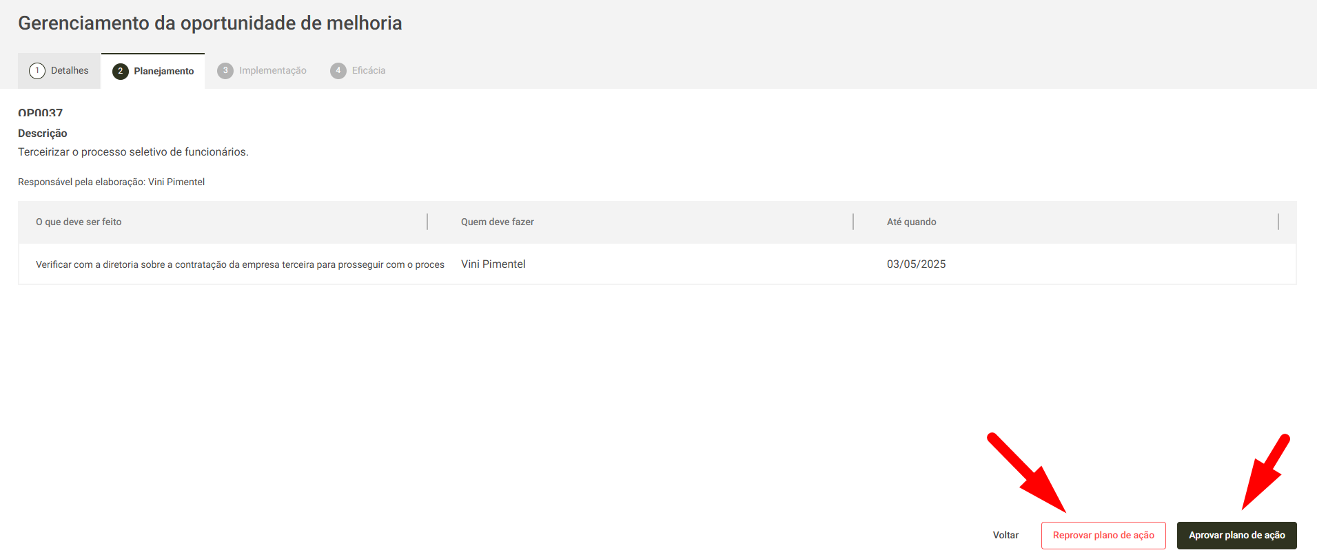 O responsável vai ter duas opções nesse caso, Reprovar o plano de ação, fazendo com que a tarefa retorne para o elaborador do plano de ação revisar o plano, ou Aprovar o plano de ação, fazendo com que a Oportunidade de Melhoria avançe de etapa, até a implementação: