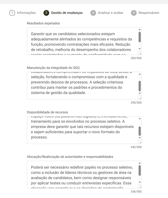 Após preencher a tela de informações da Oportunidade de Melhoria, o sistema fornece quatro campos opcionais para preenchimento, são eles: Resultados esperados, Manutenção da integridade do SGQ, Disponibilidade de recursos e Alocação/Realocação de autoridades e responsabilidades: