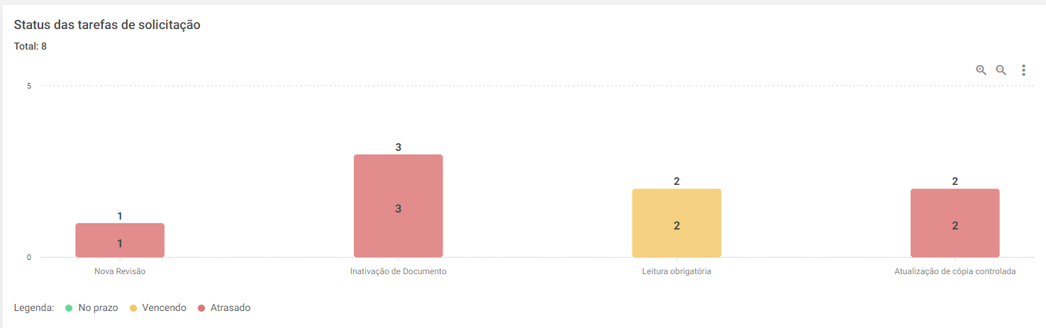 Este painel mostra um resumo das solicitações pendentes no módulo de Documentos, separadas por tipo de solicitação e classificadas de acordo com o status do prazo identificados por cores: No prazo, Vencendo, Atrasado.